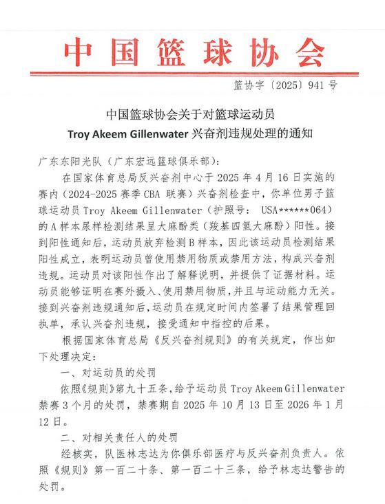 中国篮协:吉伦沃特兴奋剂违规禁赛3个月,广东队承担检测费