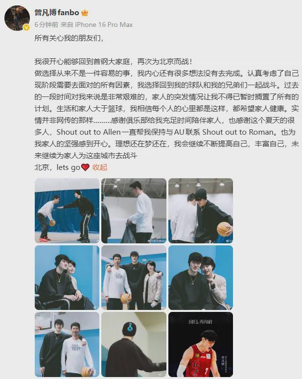 终于结束了,尘埃落定。北京队正式完成与曾凡博的续约,仅需篮网向FIBA官方出示澄清信即可注册出战CBA新赛季。曾凡博对此做出了回应,表示是因为家事拖到现在才续约,很多事并非网