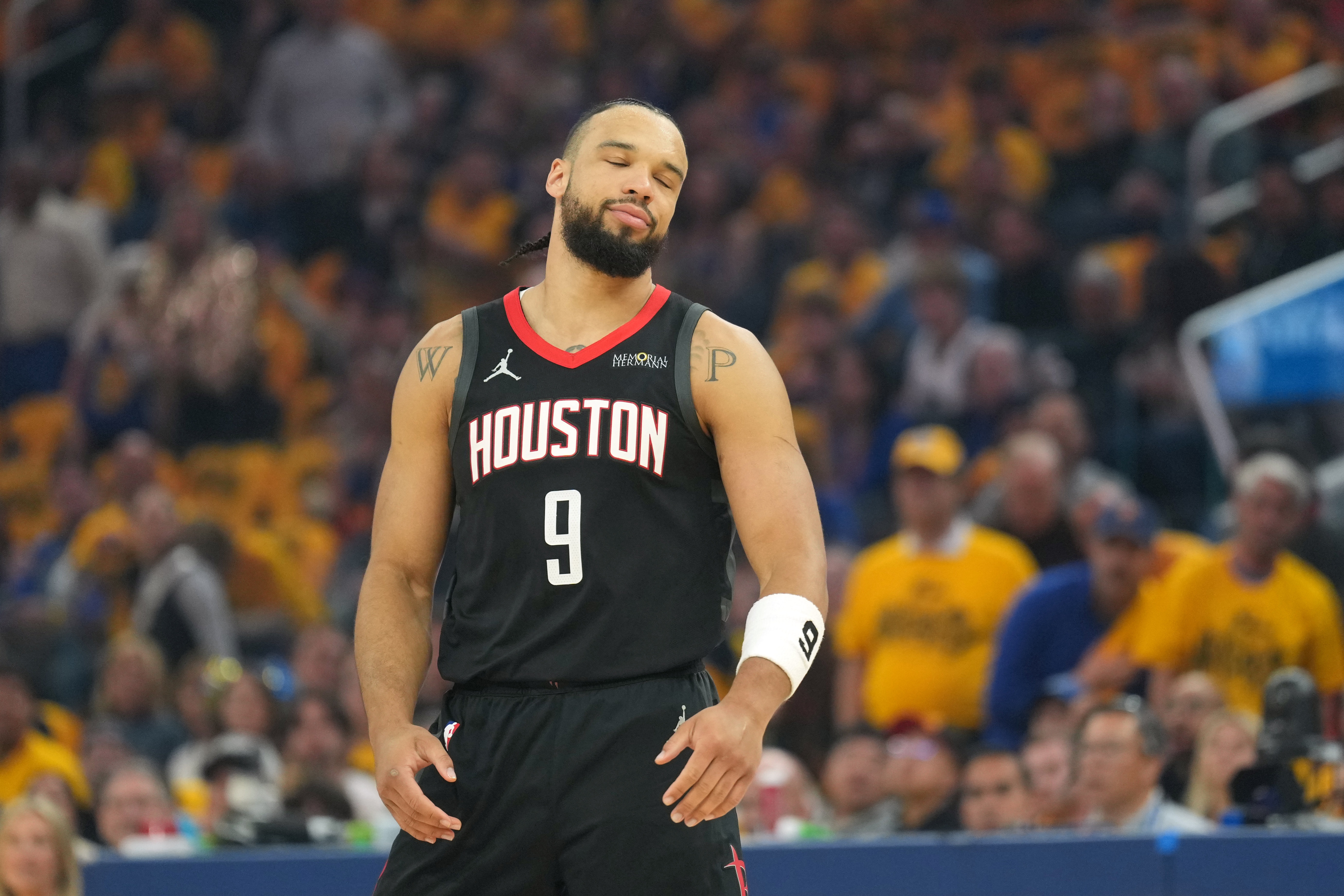 5月1日报道 NBA季后赛G5,火箭上半场以76-49领先勇士。上半场比赛,火箭后卫狄龙出战14分23秒,投篮4中3,三分3中2,罚球4中4,得到12分2助攻。