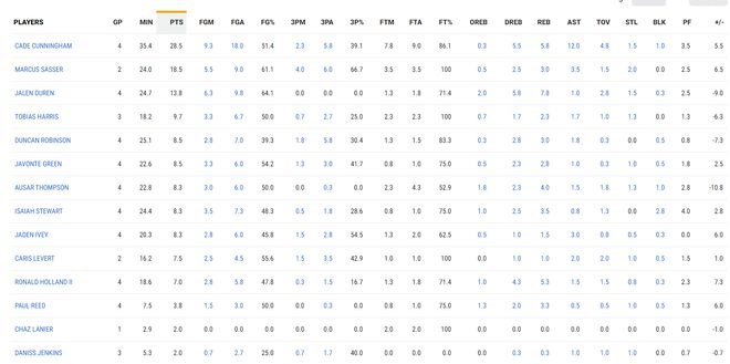 过去的四场比赛活塞场均上双的只有三人,坎宁安场均35.4分钟,拿到28.5分12助攻5.8篮板1.5抢断1盖帽4.8失误,命中率51.4%,三分命中率39.1%,坎宁安已经很努力,失误率高是因为他太多被包夹了,队友是真的给不了他什么助力。
