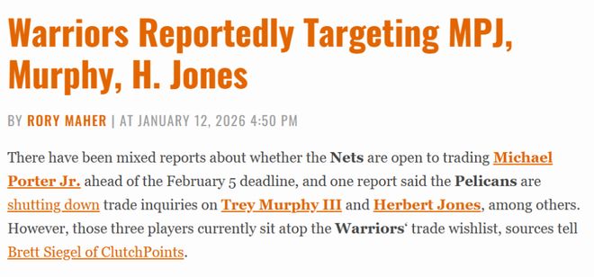 北京时间1月13日,据名记西格尔报道,尽管关于篮网是否愿意在交易截止日前送走小迈克尔-波特的报道众说纷纭,且有消息称鹈鹕已叫停特雷-墨菲和赫伯特-琼斯等人的交易询价,但这三位球员目前仍高居勇士队的交易愿望清单榜首。