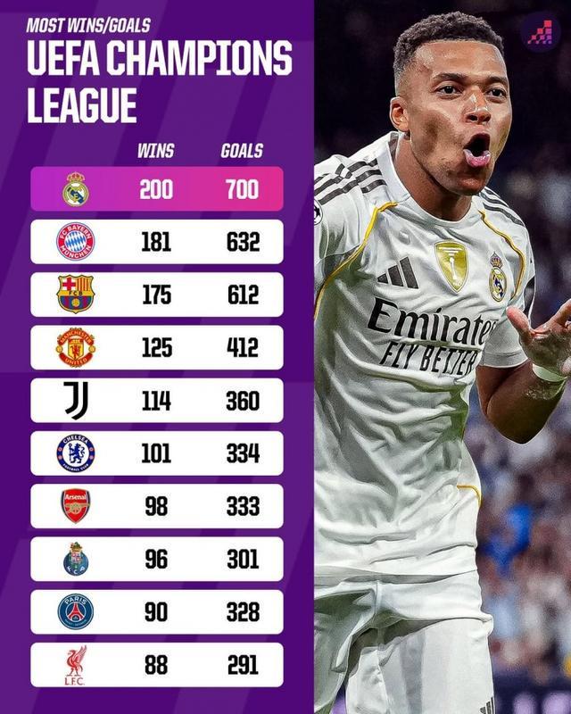 欧冠之王!皇马欧冠200场胜场和700个进球居首,力压拜仁、巴萨