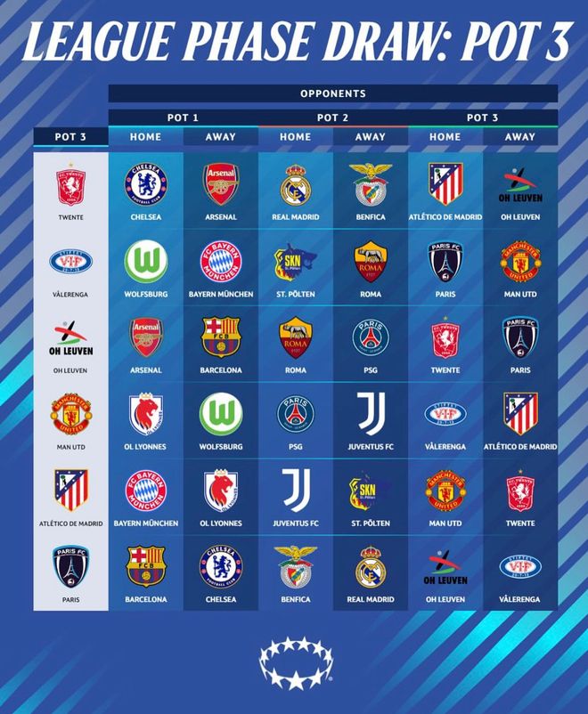 里昂女足:沃尔夫斯堡女足、阿森纳女足、圣珀尔滕女足、尤文女足、马竞女足、曼联女足