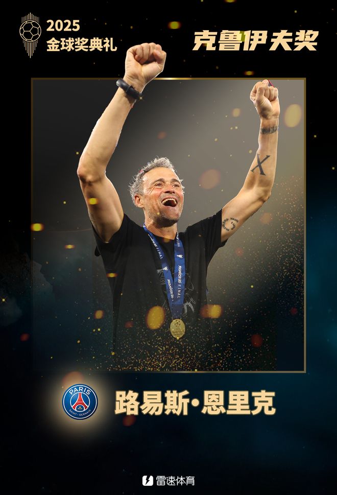雷速体育9月23日宣 2025年金球奖颁奖典礼今天进行,巴黎主帅恩里克获得2025年克鲁伊夫奖,即年度最佳男足教练。恩里克上赛季带领巴黎夺得欧冠冠军、法甲冠军、法国超级杯冠军