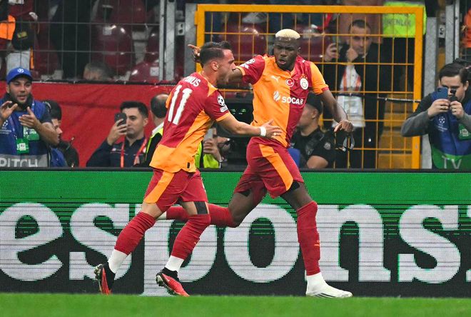 奥斯梅恩操刀主罚,大力射向中路,加拉塔萨雷取得领先。