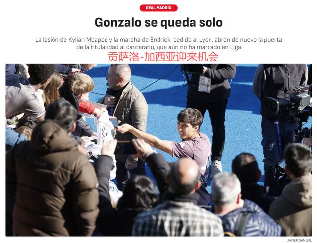 由于左膝外侧副韧带扭伤,姆巴佩将休战3周。1月3日的《阿斯报》指出,姆巴佩受伤,21岁的贡萨洛-加西亚迎来机会。去年6-7月的世俱杯,贡萨洛-加西亚一鸣惊人,沉寂半年之后,贡萨洛能否抓住机遇?