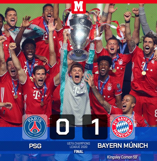 同样是2020年,欧冠决赛拜仁vs巴黎圣日耳曼。科曼打进唯一进球,拜仁夺得分量最重的大耳朵杯。
