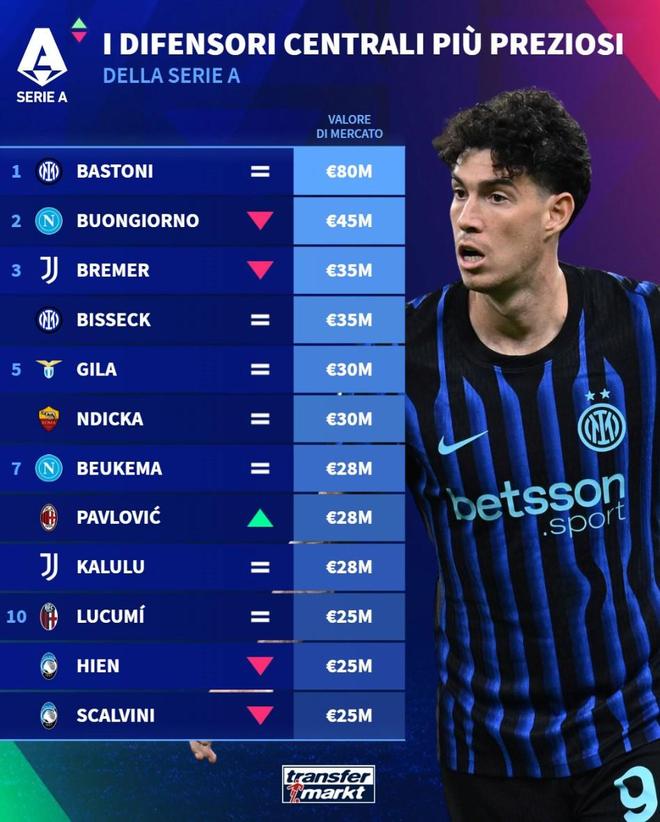 北京时间12月24日,在更新了意甲球员的身价之后,德转列出了目前意甲身价最高的10名中后卫,巴斯托尼8000万欧元断档第一,布翁焦尔诺4500万欧元第二,布雷默和比塞克3500万欧元并列第