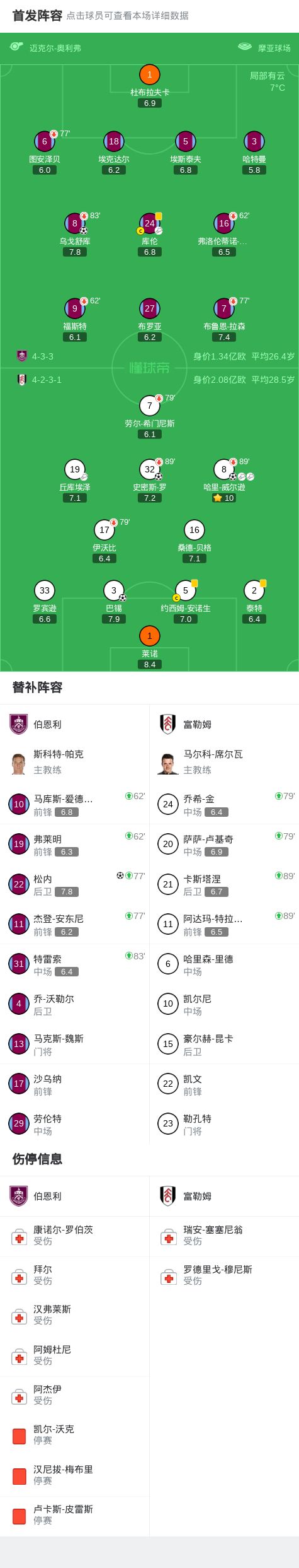 富勒姆客场32伯恩利,哈里威尔逊两传一射,史密斯罗建功