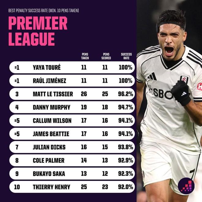 这是希门尼斯在英超联赛中第11次主罚点球,他依然保持着11罚11中的惊人纪录。