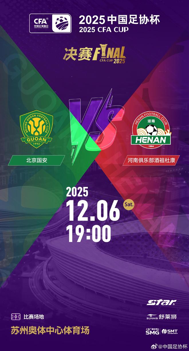 - 12月6日(星期六)19:00,备受关注的2025中国足协杯决赛将在苏州奥体中心体育场上演,由北京国安迎战河南队。11月6...发表于: 11-06 23:39